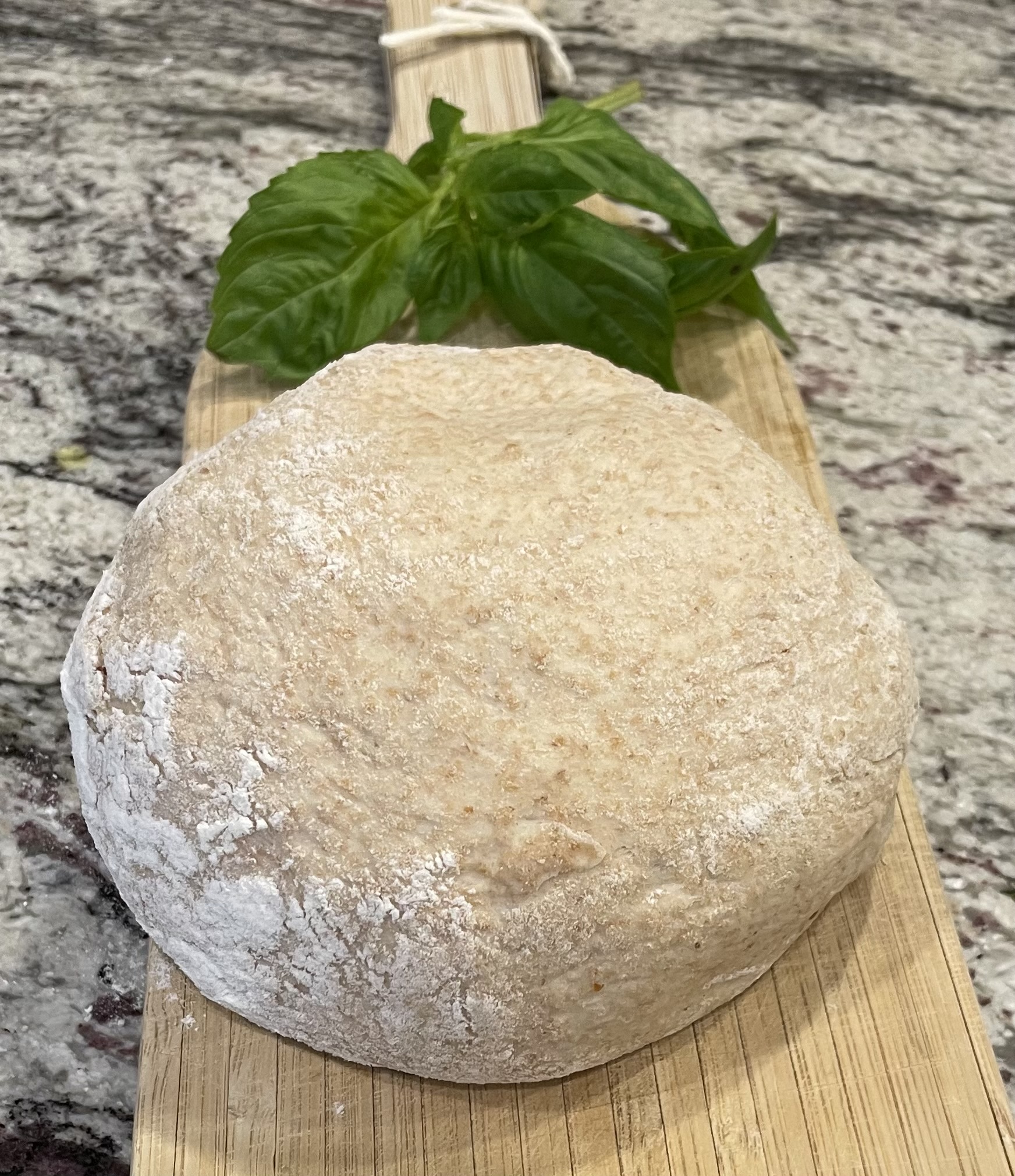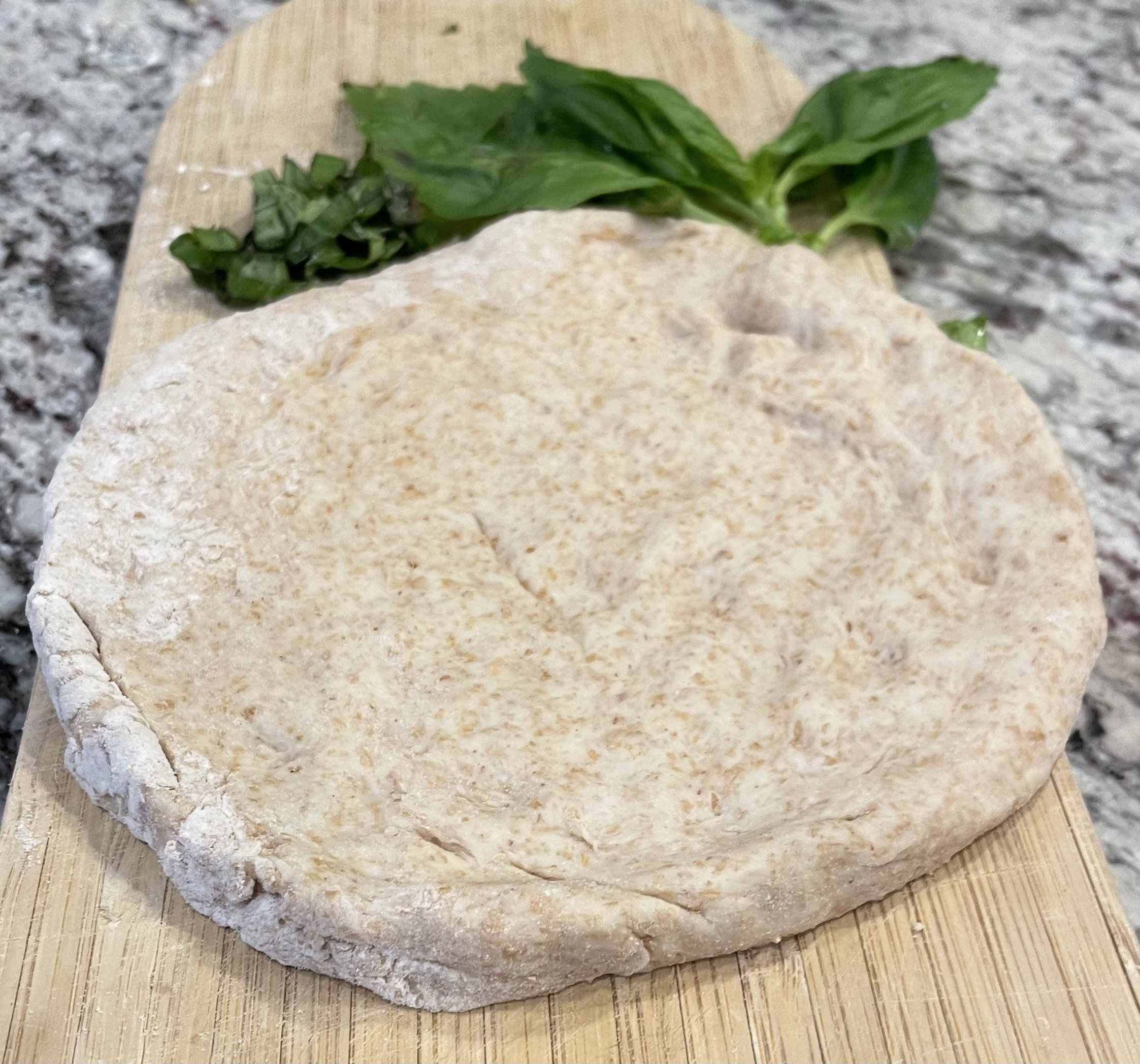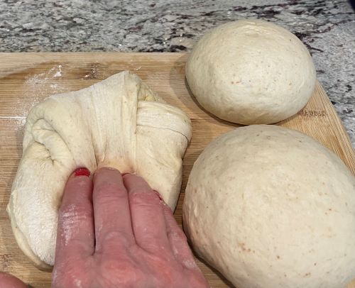To stretch/roll out the dough: Grab one dough ball and place it on a lightly floured surface. Set the other dough ball aside, still under the bowl so it won't dry out.