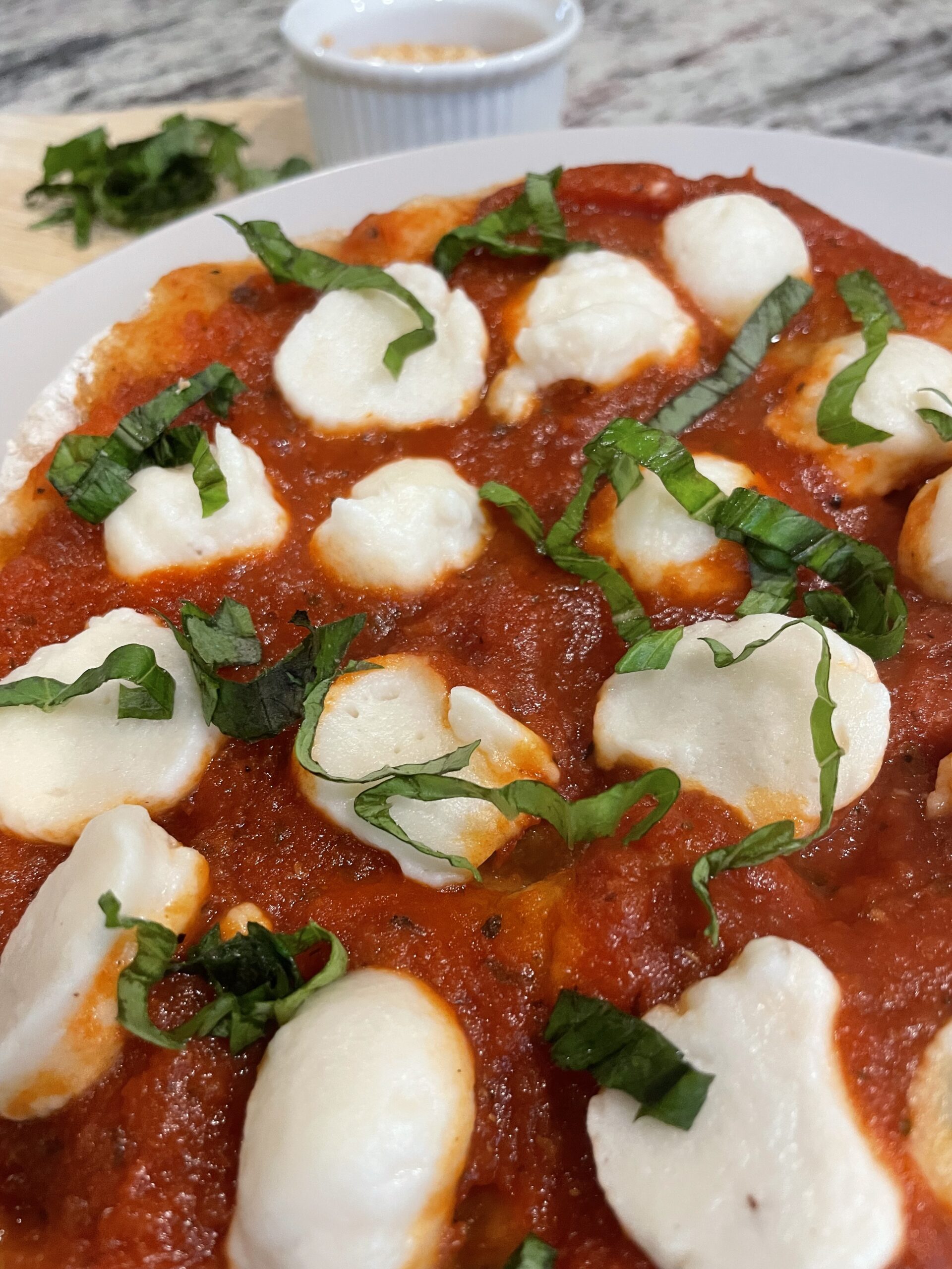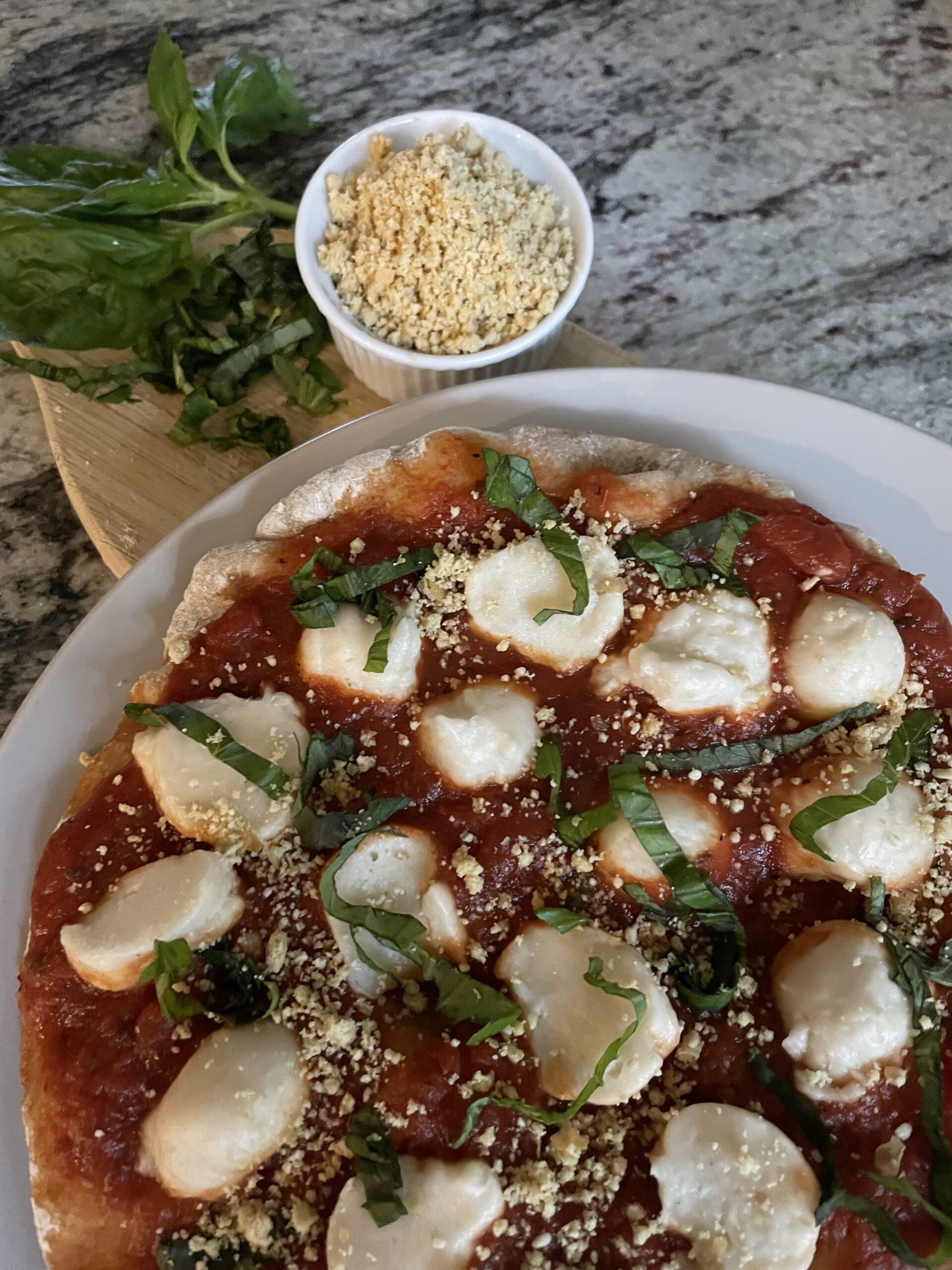 For easier moving to the hot oven, place your pizza crust round on a piece of parchment and top with your favorite pizza sauce, vegan mozzarella cheese (include links), and vegetable toppings. Maybe add some vegan ricotta and vegan parmesan cheeses (include links). 1 cup tomato pizza sauce -divided2 cups vegan mozzarella -dividedVegetables such as mushrooms, spinach, peppers, onions, etc.