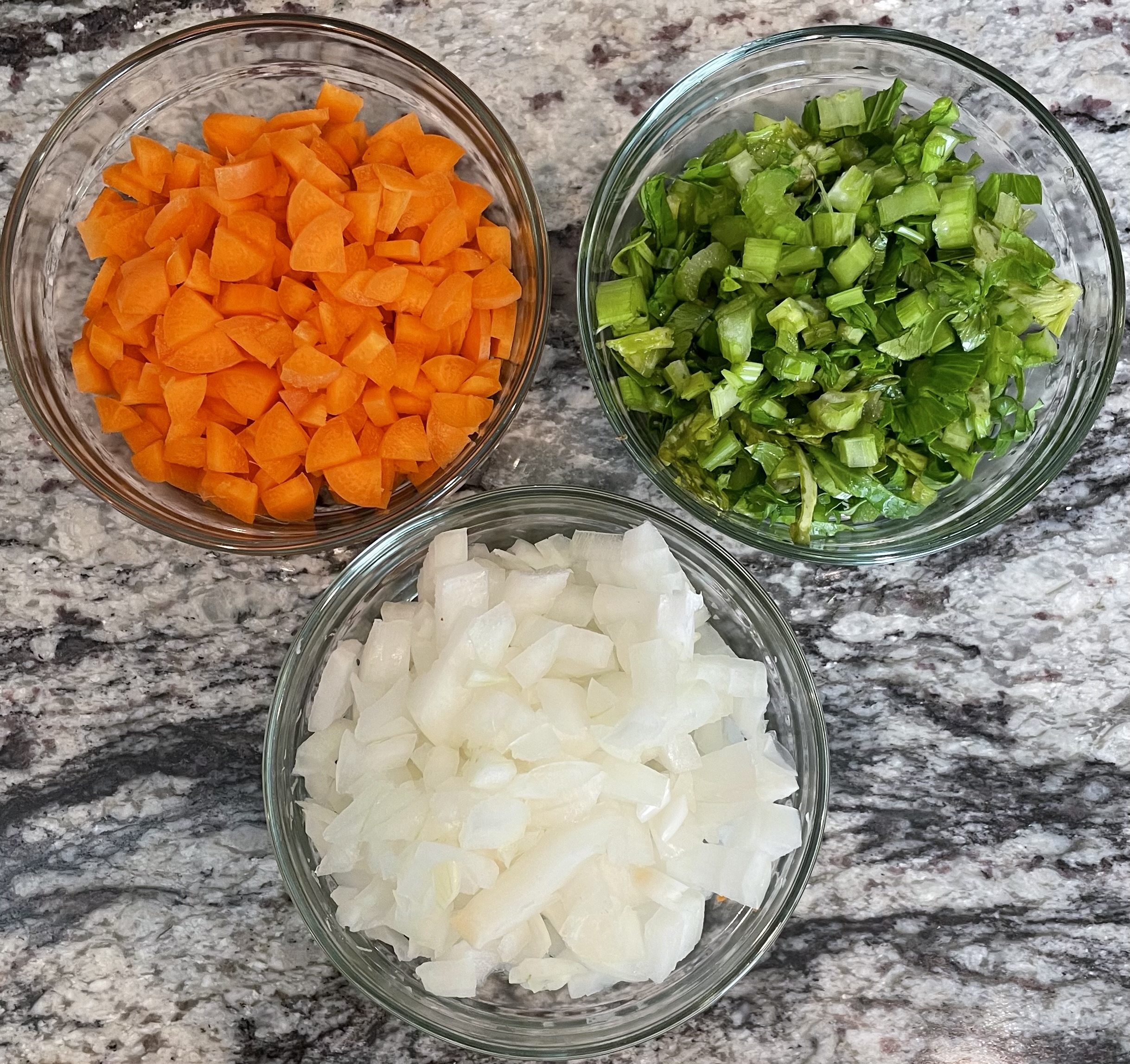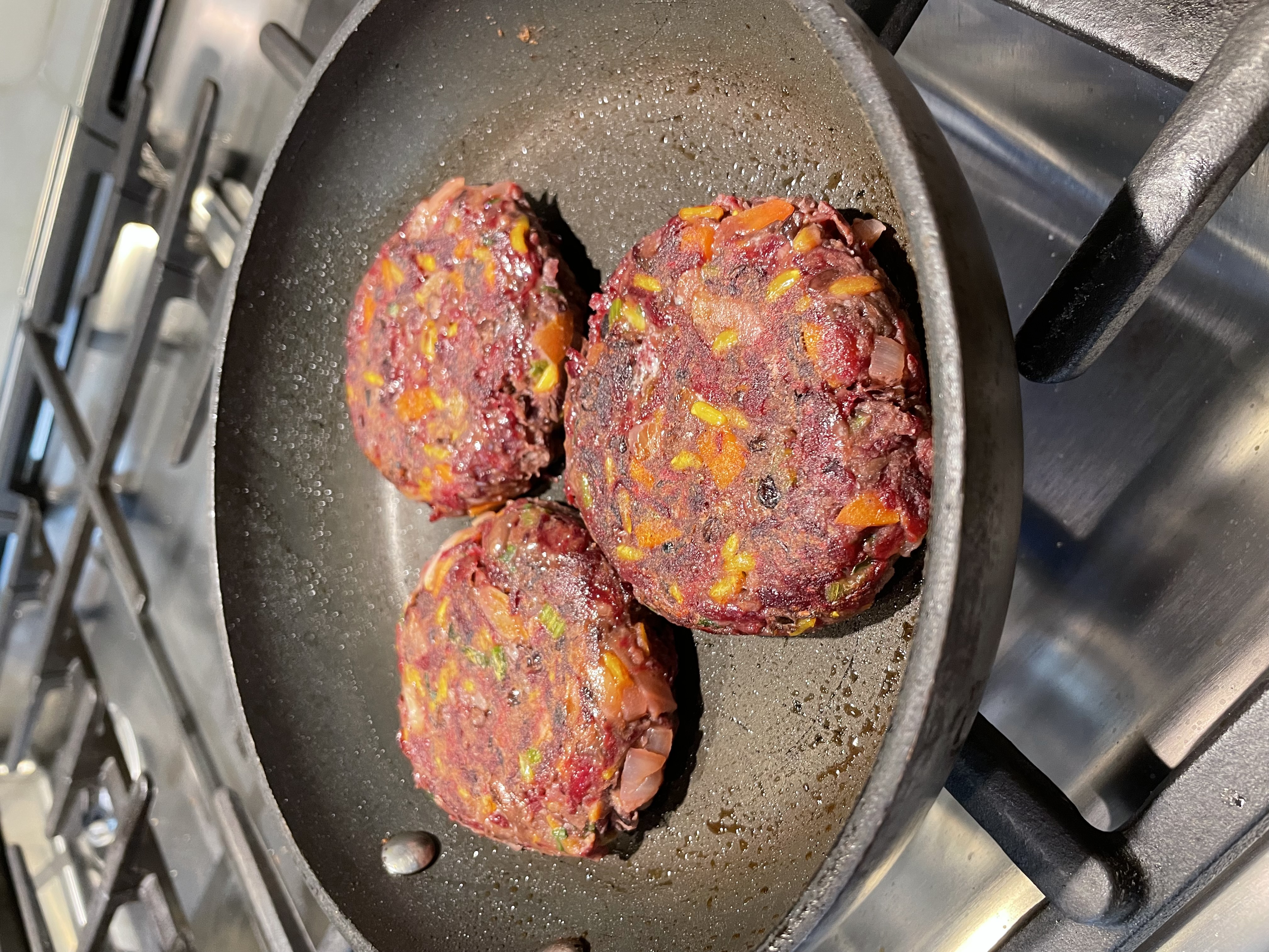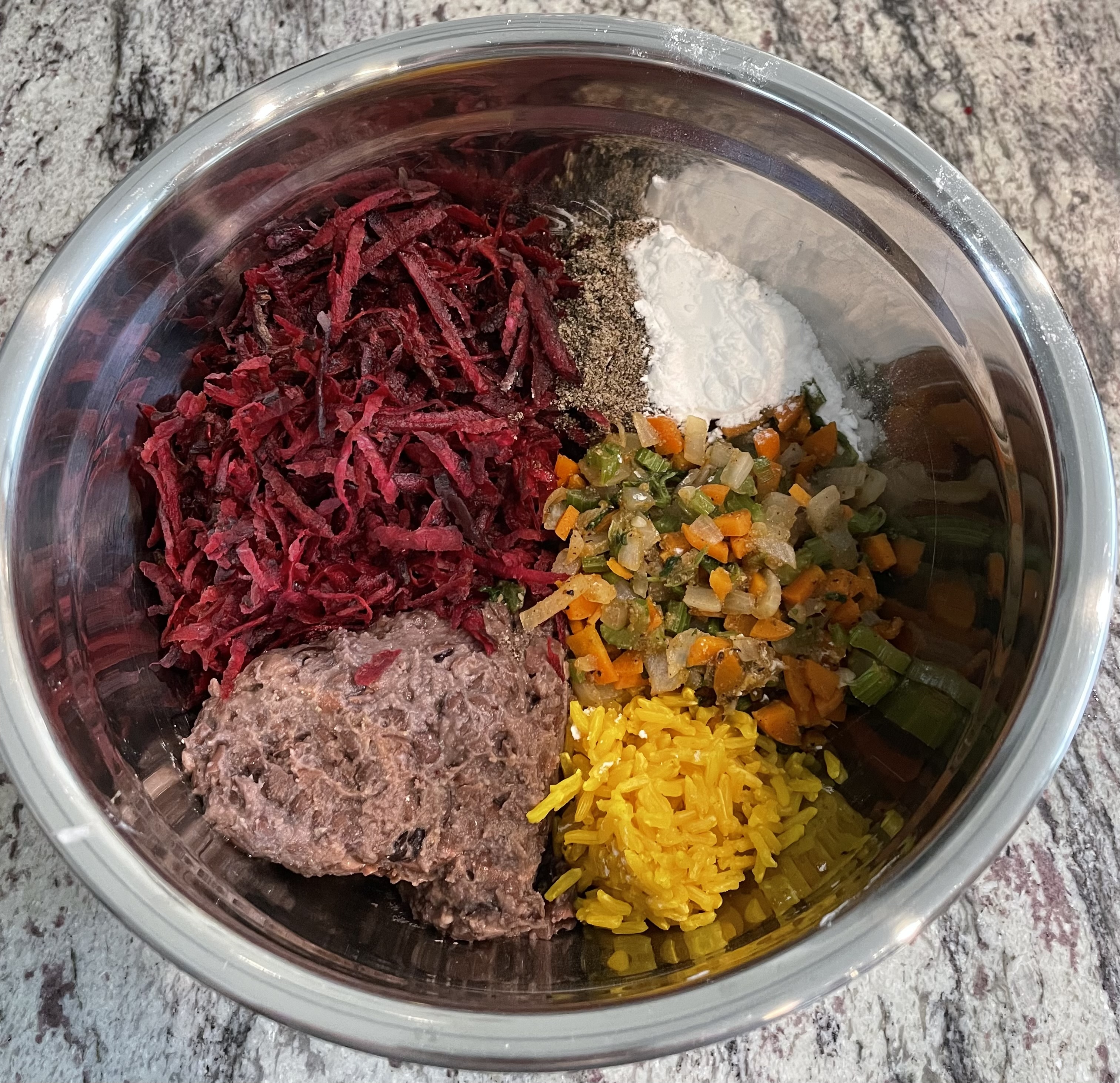 Add finely chopped onion, carrot, and celery to a small sauté pan and cook until translucent. Fold into the black beans and beet mixture.