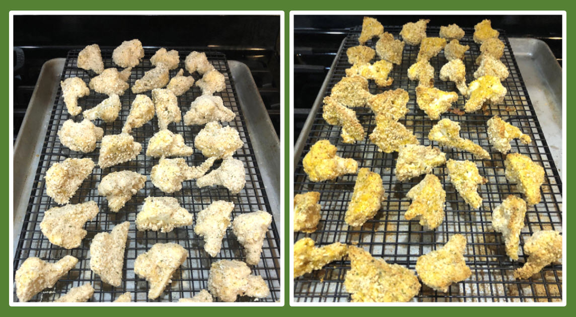 Place the breaded Cauliflower on the prepared baking sheet and bake until golden brown. In conventional oven 35-40 minutes and about 20-25 minutes for convection oven.