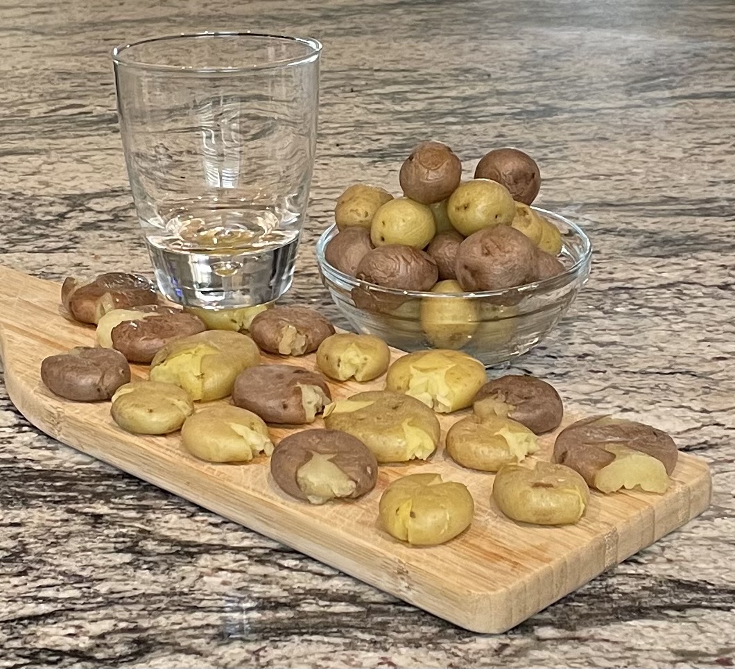 Using the bottom of a glass, gently press each potato, just breaking the skin to flatten into a disc.