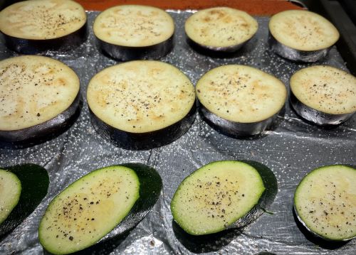 Cut eggplant into 1/4 inch slices and layer in baking dish. Season with salt and pepper.