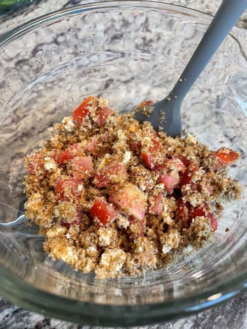 While eggplant to baking, assemble topping. Chop tomato. In a large bowl, combine breadcrumb, crumbled tofu, chopped tomatoes, vegan parmesan, and seasoning mix.