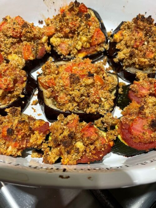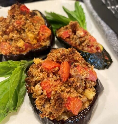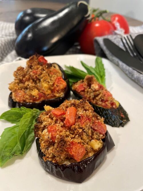 This delightful Deconstructed Crispy Eggplant Bake dish is oil-free and dairy-free, making it a wholesome and healthy option for everyone. Slices of tender, oven-crisped eggplant are layered with a vibrant homemade tomato sauce and sprinkled with a savory blend of herbs and spices. The crispy topping is great on other vegetables as well such as zucchini or cauliflower. Simple yet elegant, this bake is an ideal addition to your weeknight dinners or special occasions.