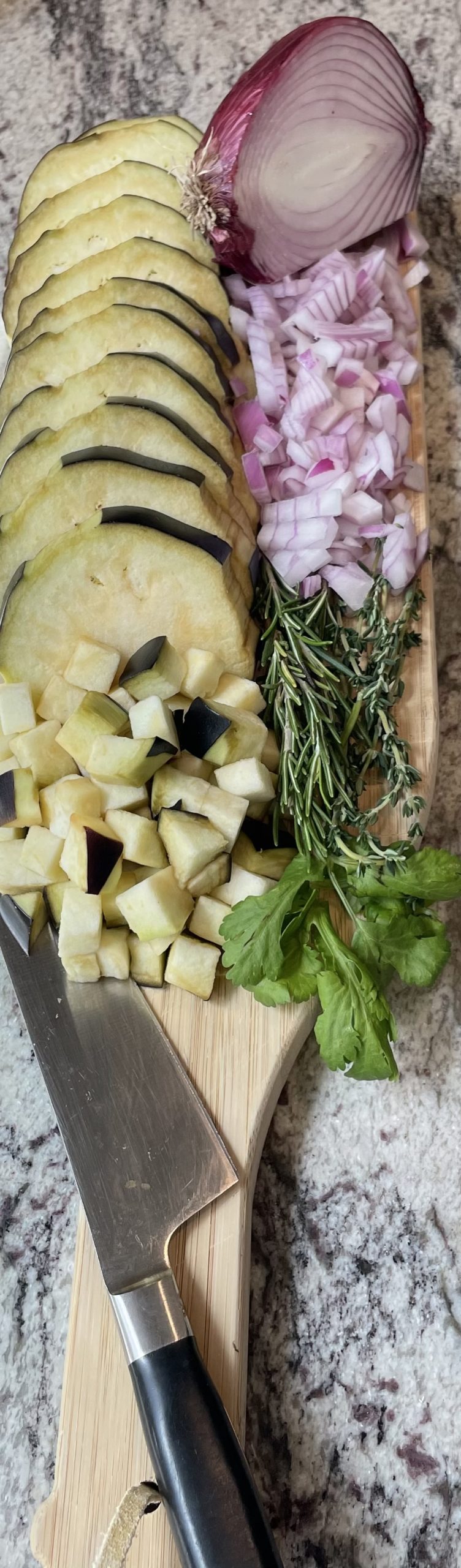 Chop the eggplant and onion into a small dice (¼ inch cube). Set aside.