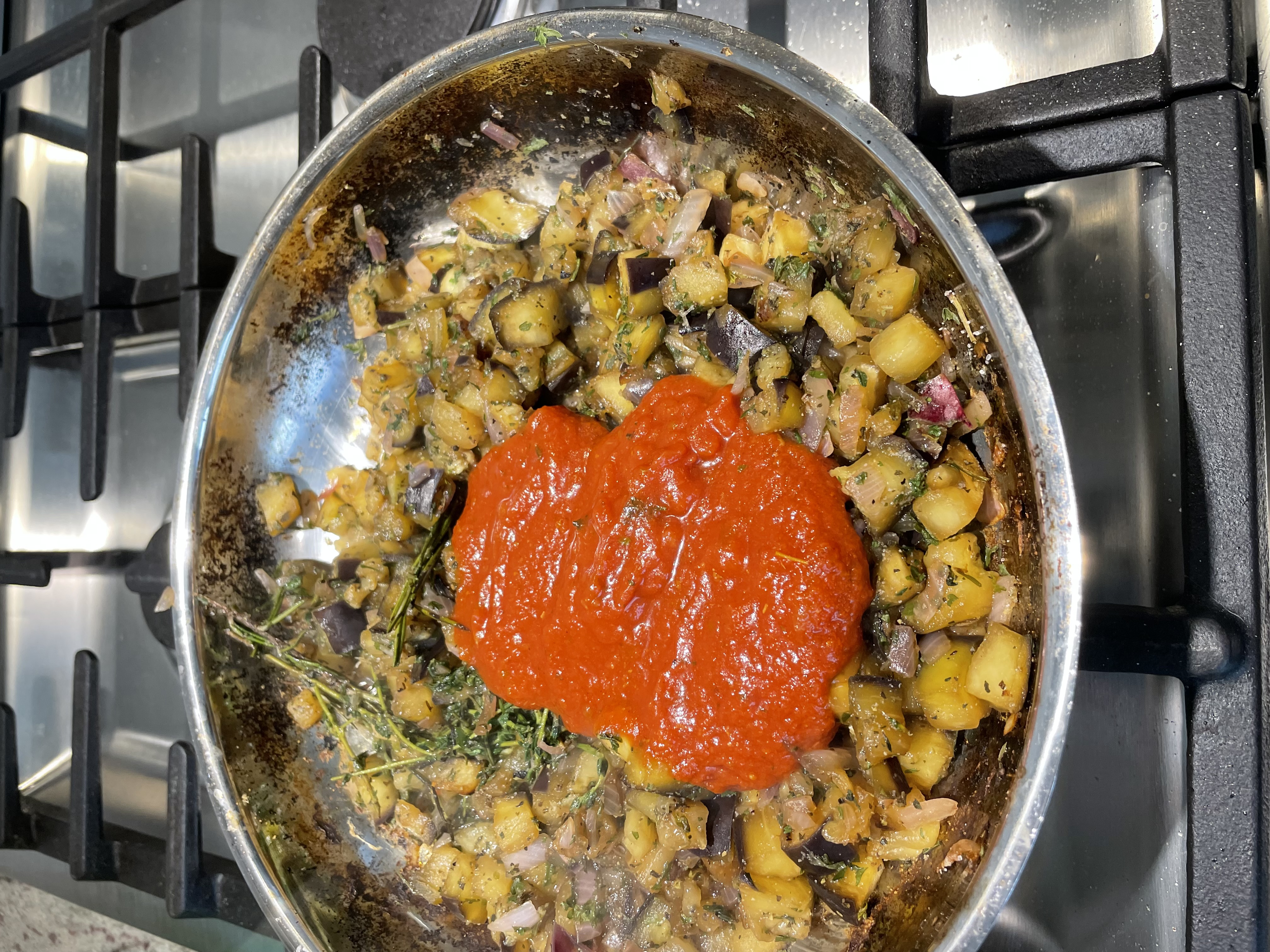 Heat a medium sauté pan over a medium heat. When water drops dance on the surface like mercury balls, the pan is a the right temperature to add eggplant and onions (no need to use oil). Move veggies around in the pan to avoid burning. If the veggies cook too quickly, lower the heat and add a bit of water to avoid burning.