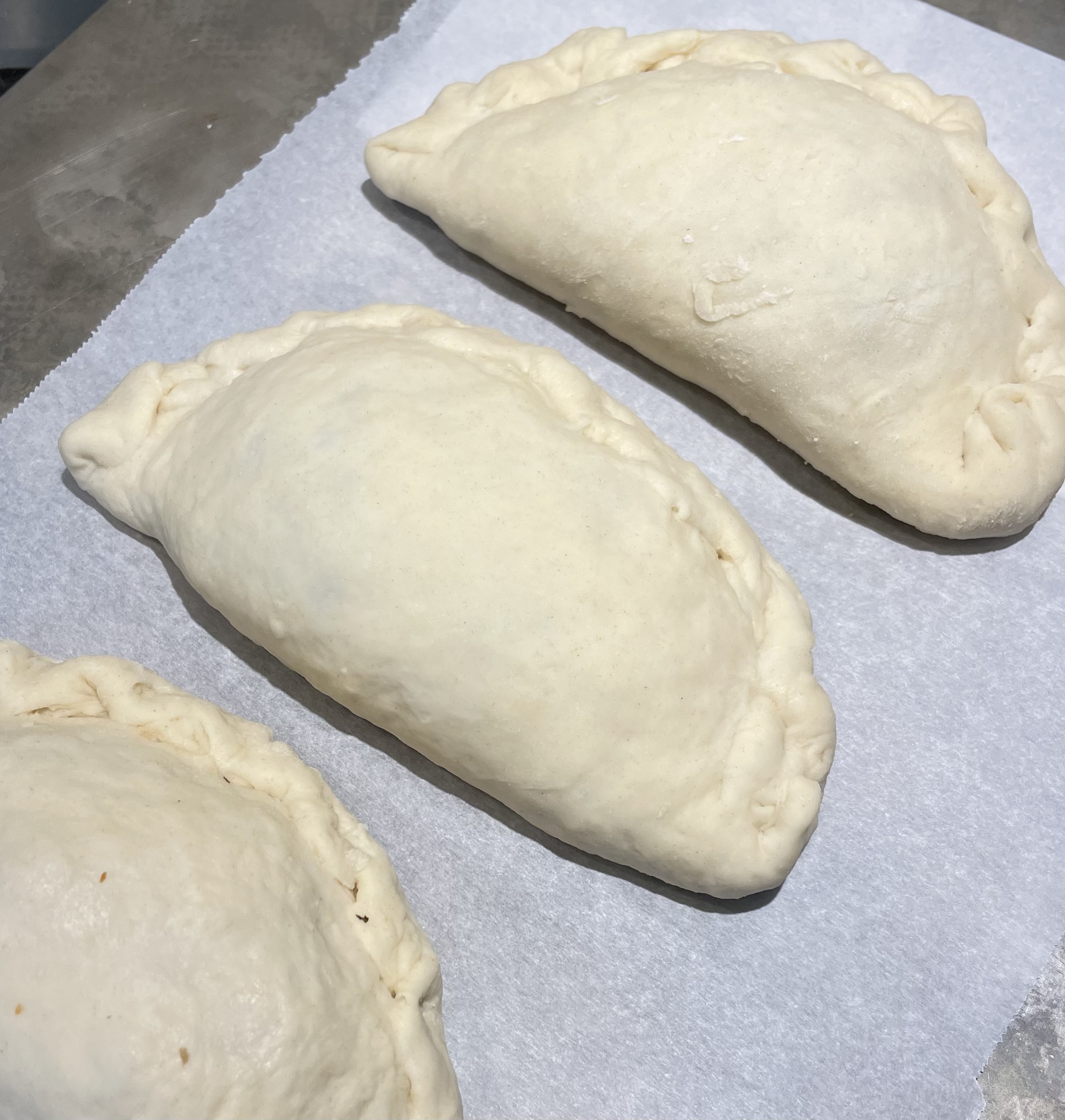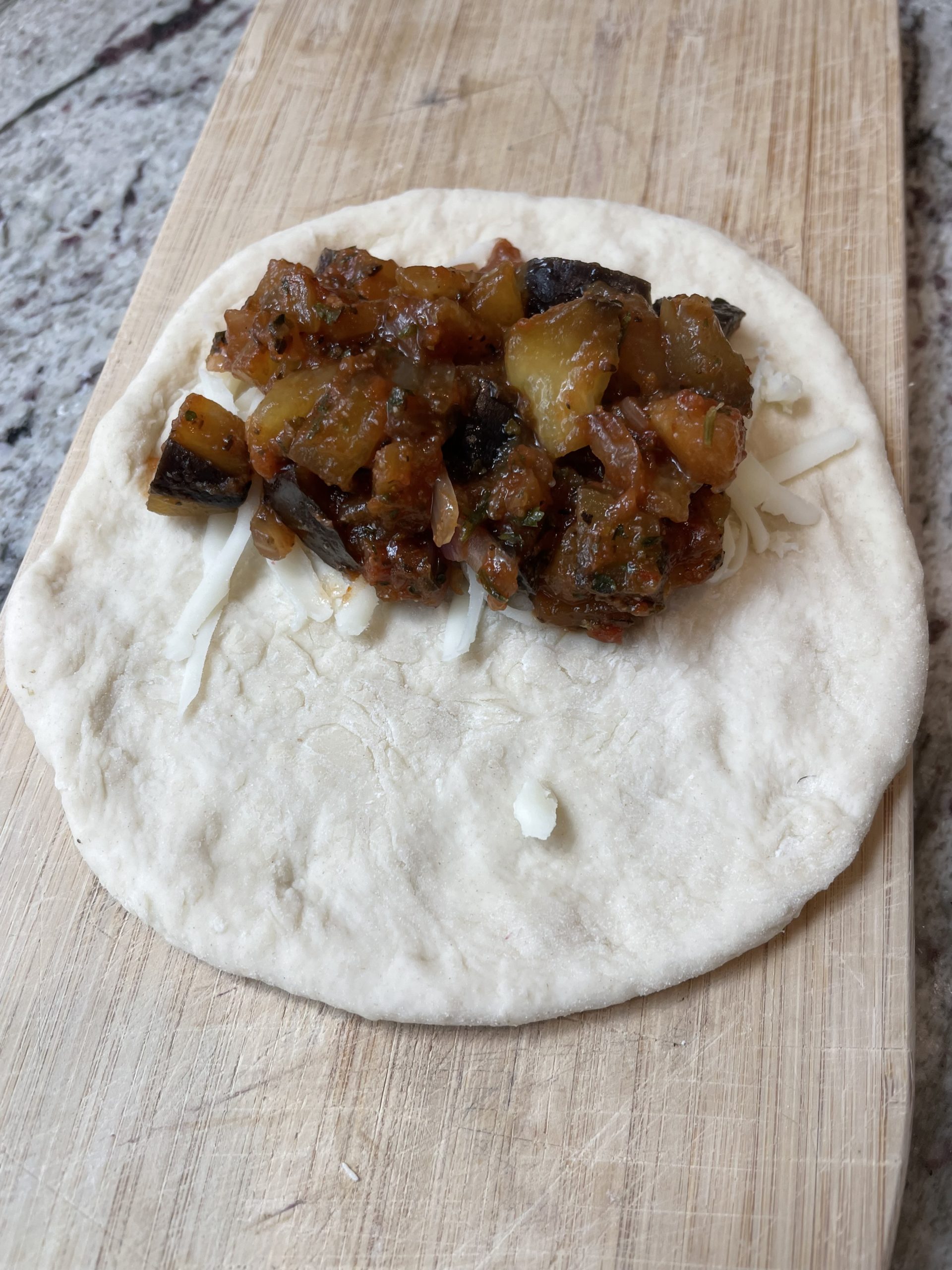 Form each ball into a circle. Place a slice of the plant based mozzarella on the into the upper half of the circle dough. Place 2-3 tablespoons of eggplant mixture on the mozzarella. Folder over and press to seal.