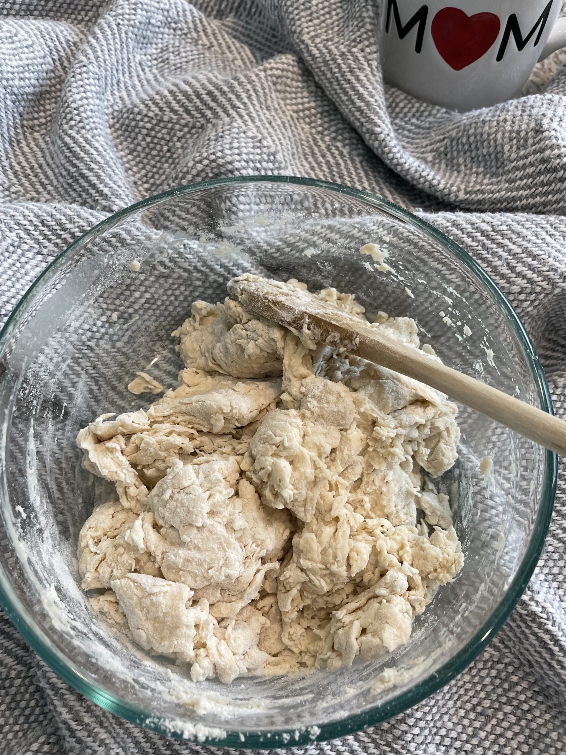 Dough will be shaggy looking. Keep kneading until it comes together.