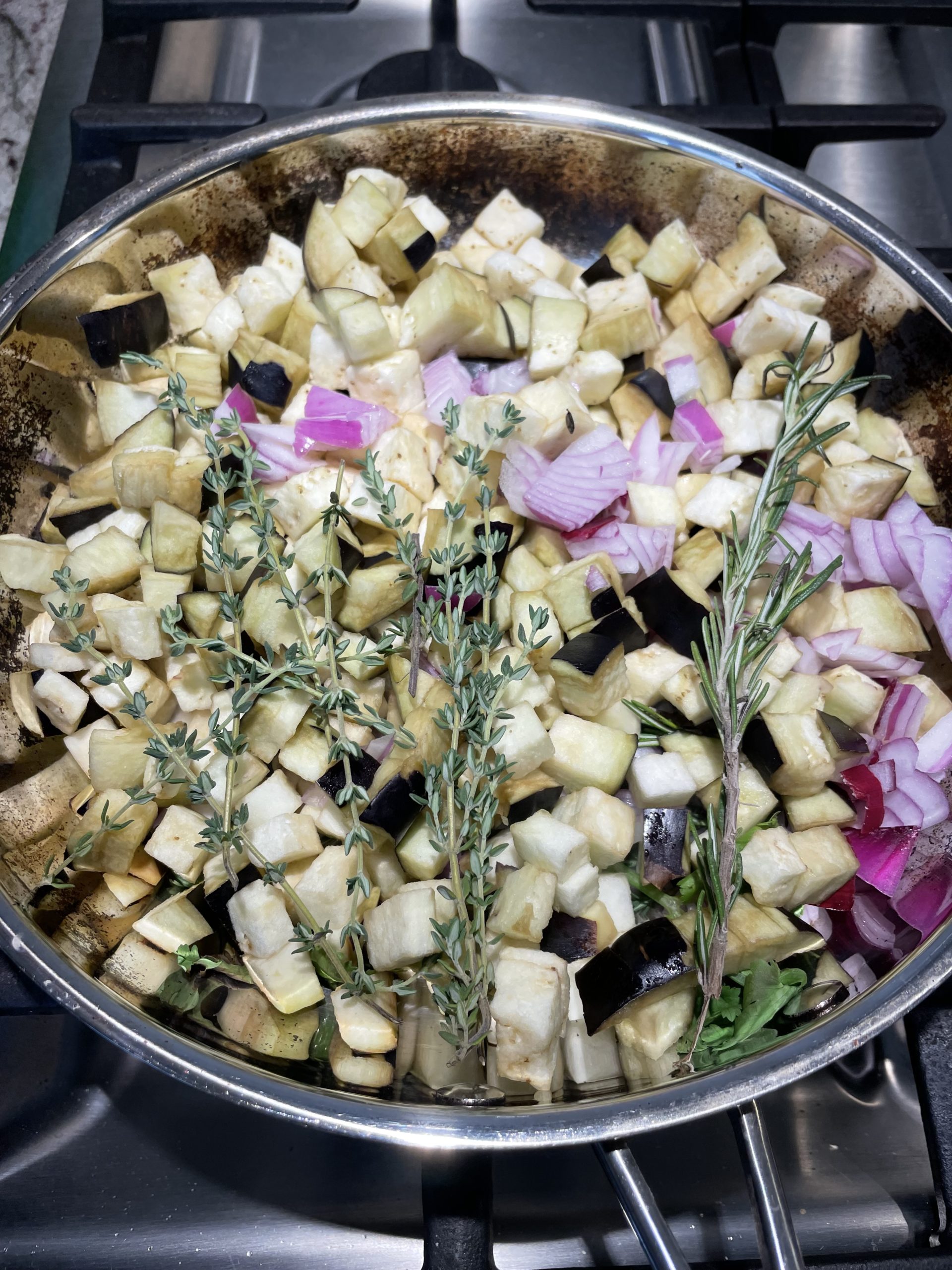 Once the veggies are browned (10 minutes), mix in the herbs. Cook another 5 minutes.