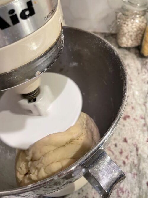 Add 2 cups more flour and using the dough hook knead at high speed for about 3 to 4 minutes, it’s smooth and sticky. Add more flour if needed. (I used an additional quarter cup.) The dough will be very sticky, just scrape down the sides as you stir and add a tablespoon more flour until it comes away from the sides of the bowl.
