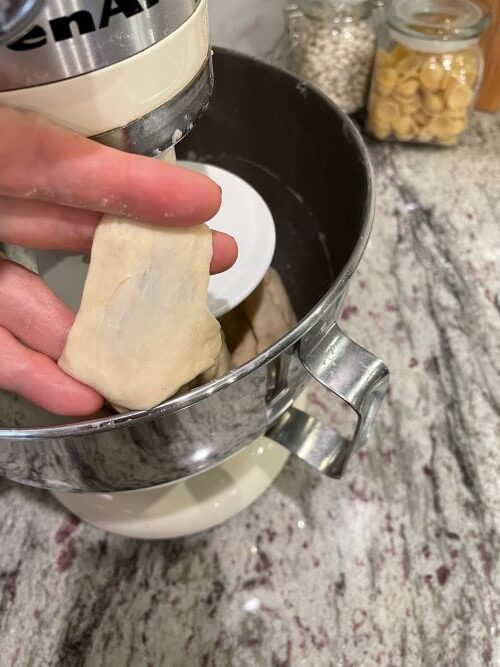 To test if the dough is adequately kneaded, take a small piece and gently stretch it thin between your fingers. If it stretches without breaking and forms a translucent membrane, it's a sign that the gluten has developed sufficiently, and your dough is ready to rise.