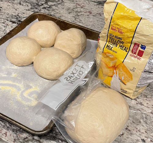 Sprinkle about 2 tablespoons of corn meal onto the parchment paper in the pan.