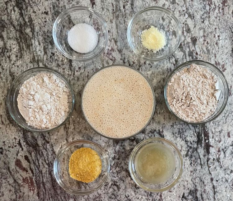 Mix the sourdough starter, aquafaba, both flours, Nurtional Yeast, salt, and butter powder until you have a cohesive dough. It will be a little sticky. Turn the dough out onto a lightly floured work surface and form into a ball. Flatten slightly and divide into 2, 4, or 6 portions, pat each into a rectangle, wrap in plastic wrap. Refrigerate for at least 30 minutes, or longer until the dough firms up a bit. 30 minutes is usually all you need but you can leave the Refrigrrate for up to 2 days.