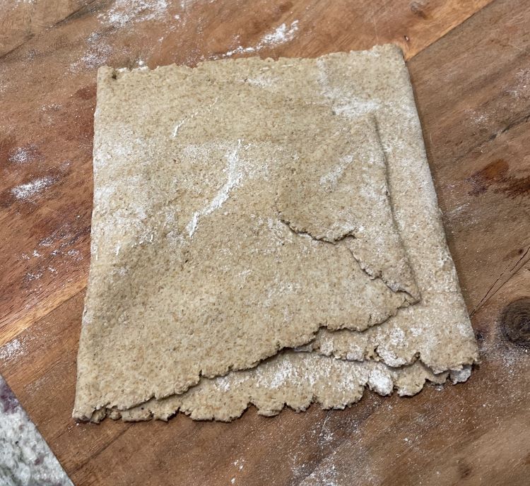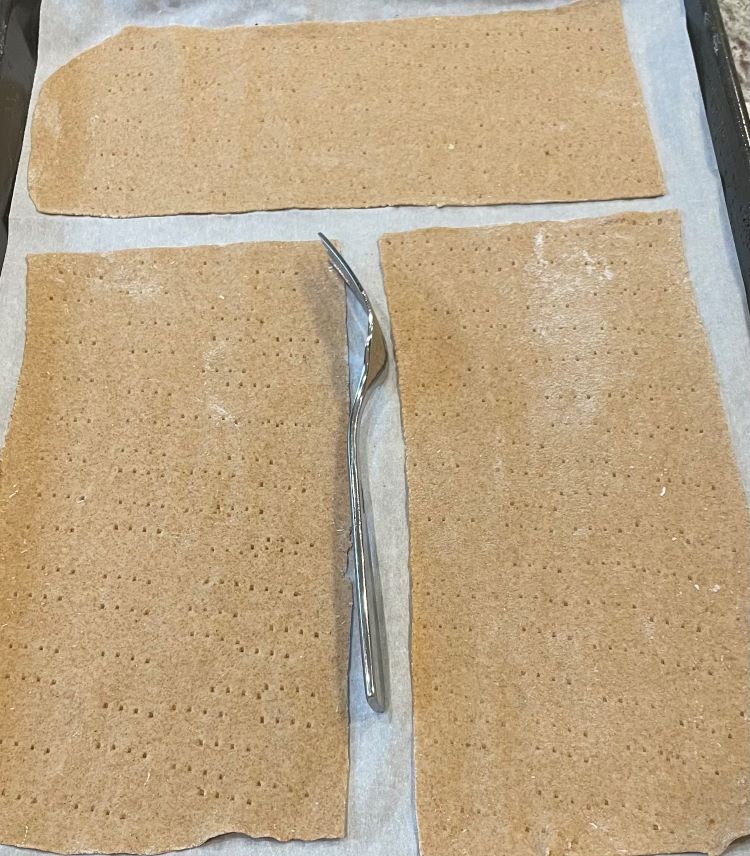 Move the setting to the 6th dial position and thread the dough through the pasta roller machine.Place dough on a sheet pan lined with parchment paper. Pierce with a fork to reduce crackers puffing up during baking.
