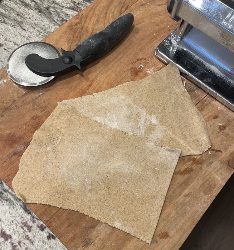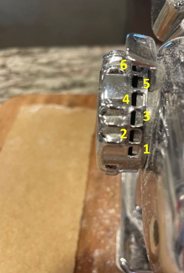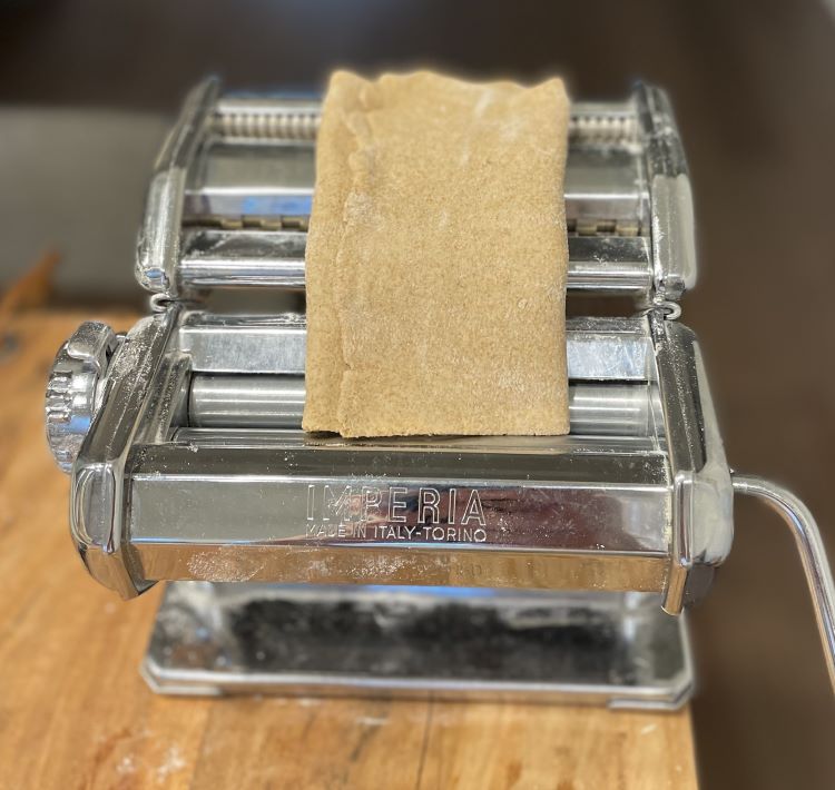 Move the setting to the 4th dial position and thread the dough through the pasta roller machine twice. If the dough sheet is very long, cut in half.