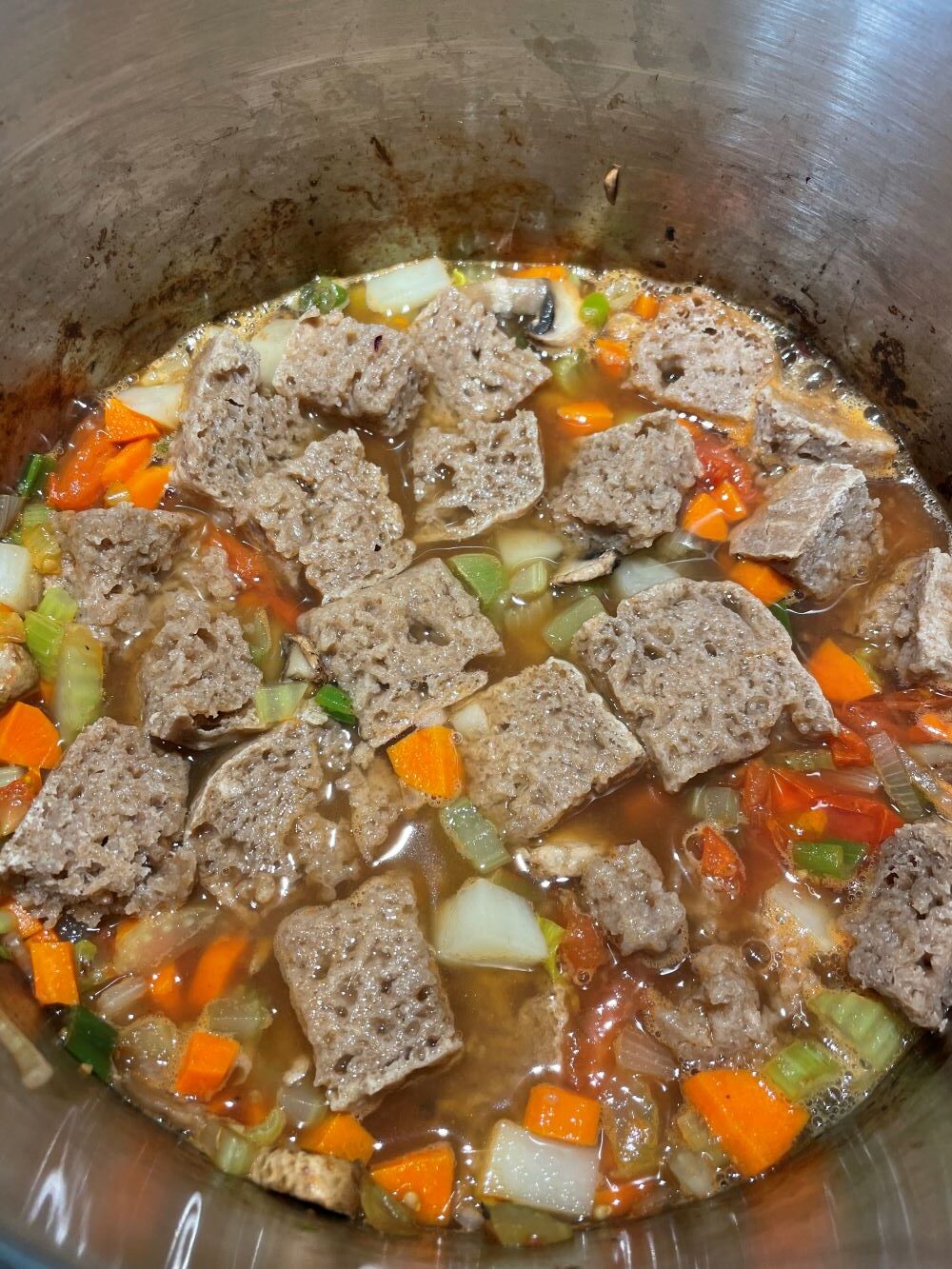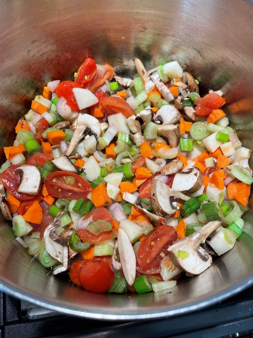 Dry sauté Vegetables in a large pot over medium heat. Add chopped onions, garlic, carrots, and celery. Sauté until the vegetables are softened.