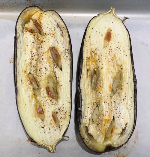 Bake Eggplant by adjusting oven rack to upper-middle position and heat to 350 degrees. Line a rimmed baking sheet with parchment paper. place eggplant, flesh down and bake for 20-25 minutes until fork tender.