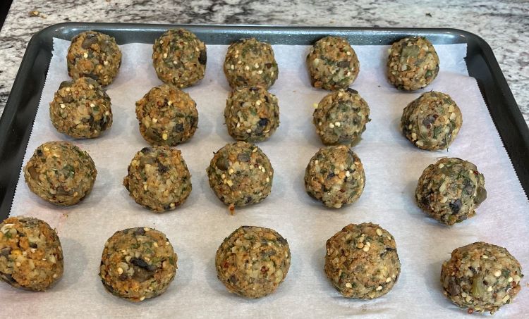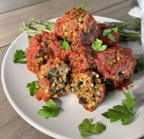 Depending on how big or small you make them, it yields 15-30 so plenty to freeze and use at a later time for a quick weeknight dinner for a meatball sub or with a pasta and sauce of your choice.I advise against combining the ingredients and refrigerating them for an extended period before rolling and baking. I attempted this, but it was unsuccessful. I encountered difficulty rolling the mixture, which I attribute to the moisture released from the vegetables during refrigeration, resulting in a soggy consistency. Despite extending the baking time in an attempt to address this issue, they were still mushy.This makes a great appetizer when topped with my Best WFPB Italian Alfredo Sauce (No Dairy).