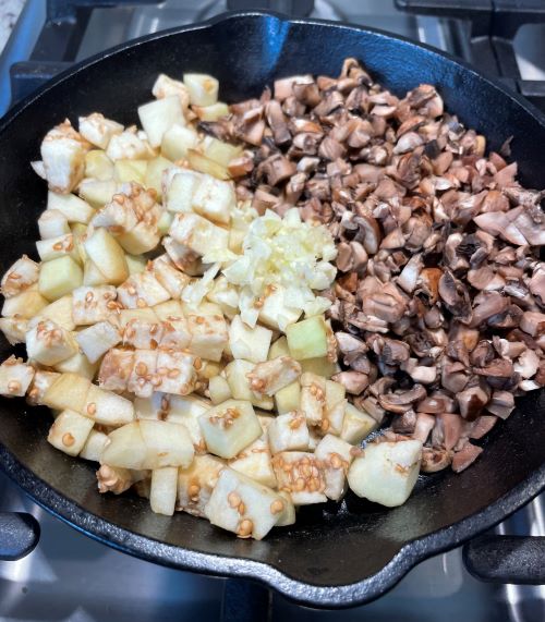 You can also dice eggplant into 1/2 cubes and saute with mushrooms in next step.