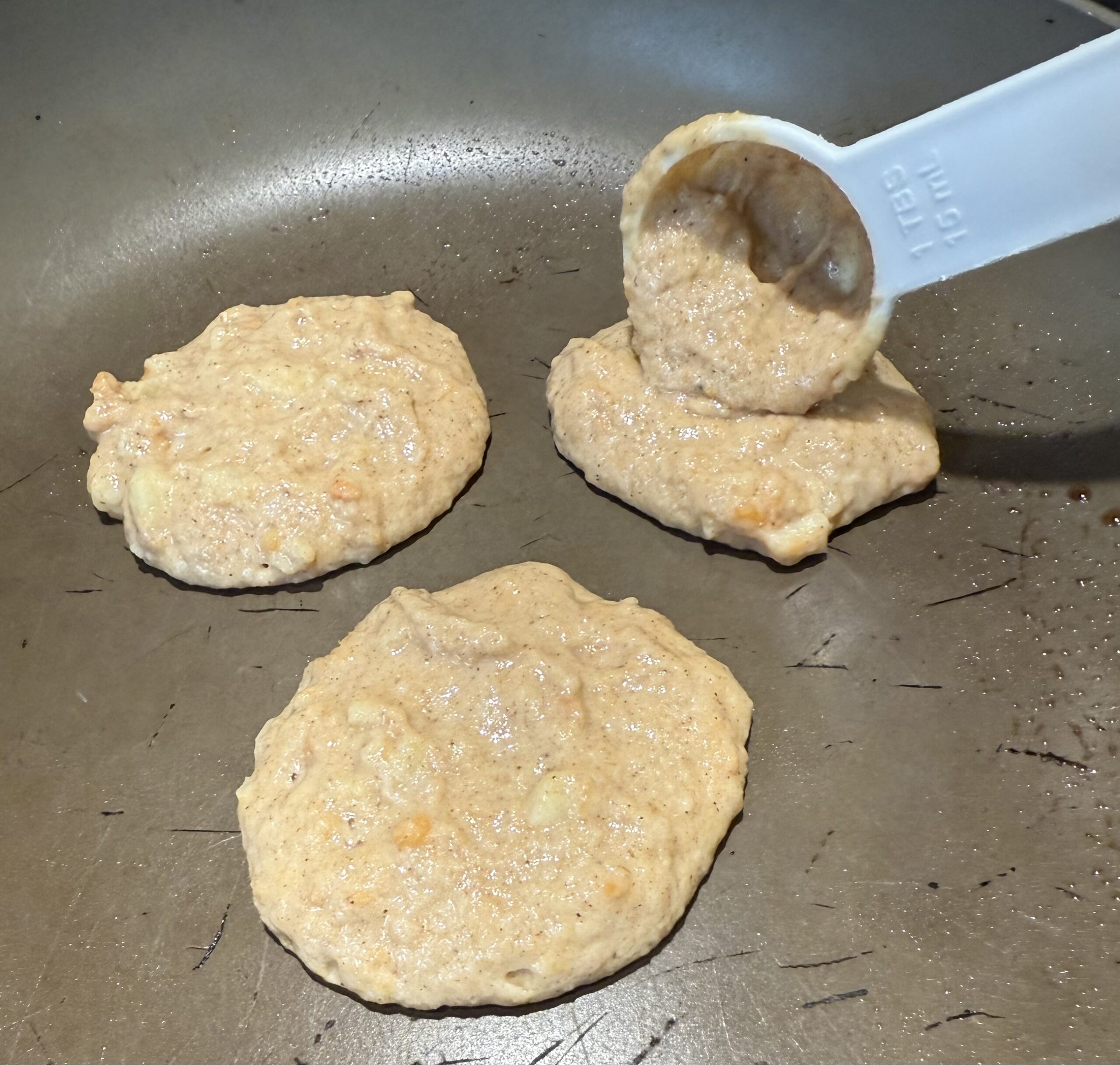 Drop small spoonfuls of batter (about 1 tablespoon each) onto the skillet. Cook for 2–3 minutes per side, or until golden brown and cooked through.