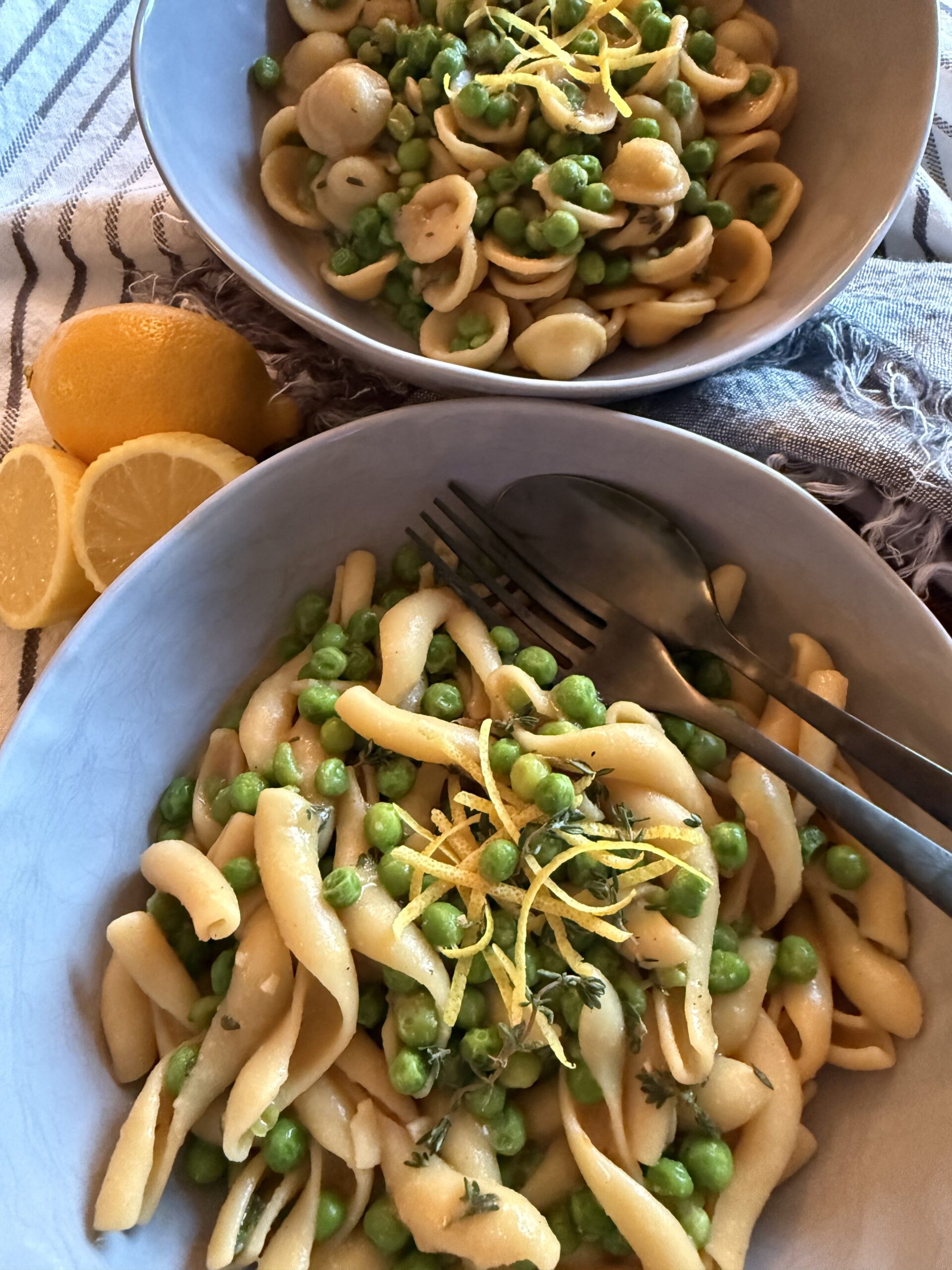 Flavor boosters: Finish with lemon juice, black pepper, and herbs to brighten the lightly coated peas and pasta without any oil or cheese.