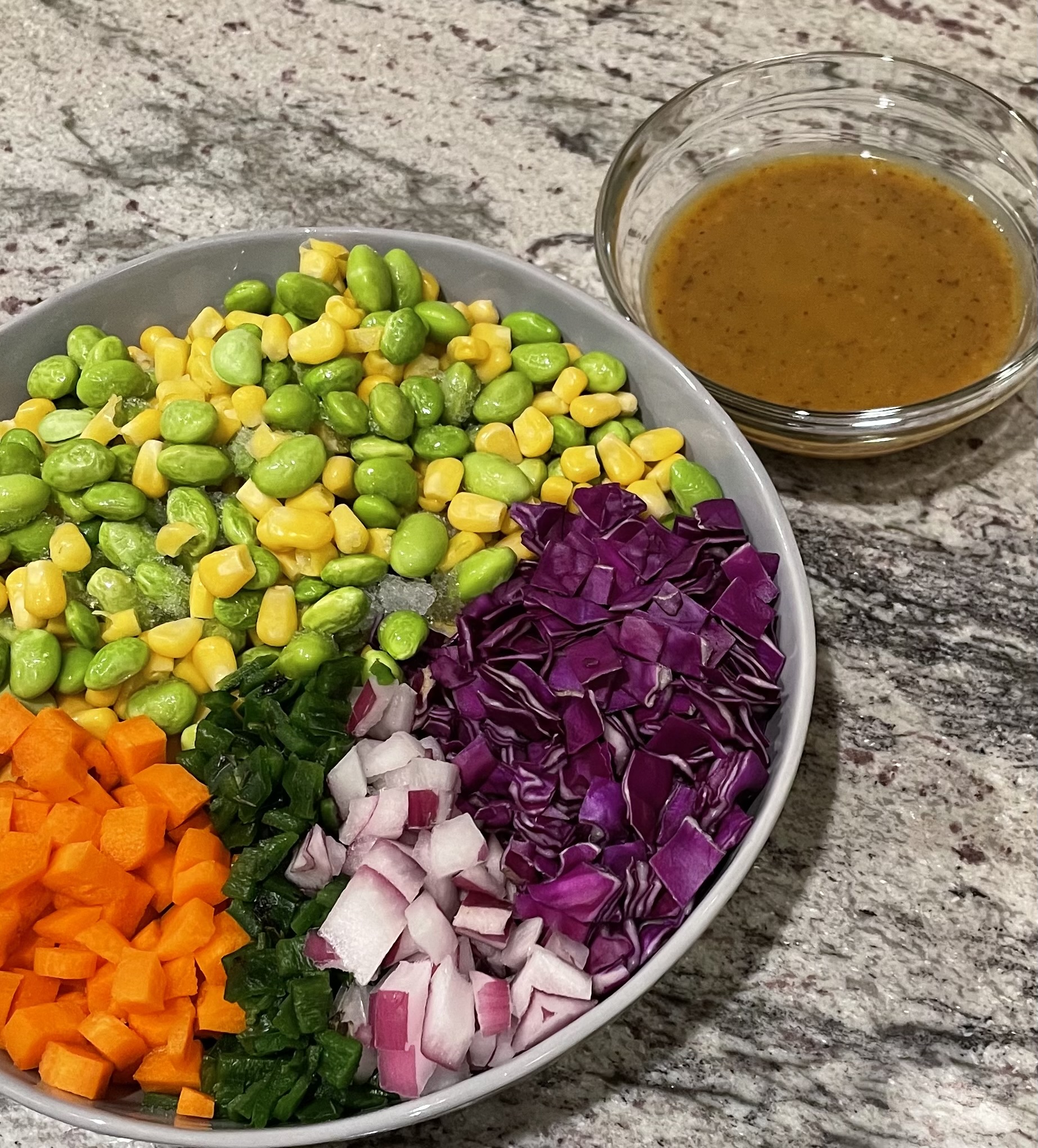 Combine all vegetables: edamame, corn, chopped onion, pepper, carrots and cabbage. Set aside.