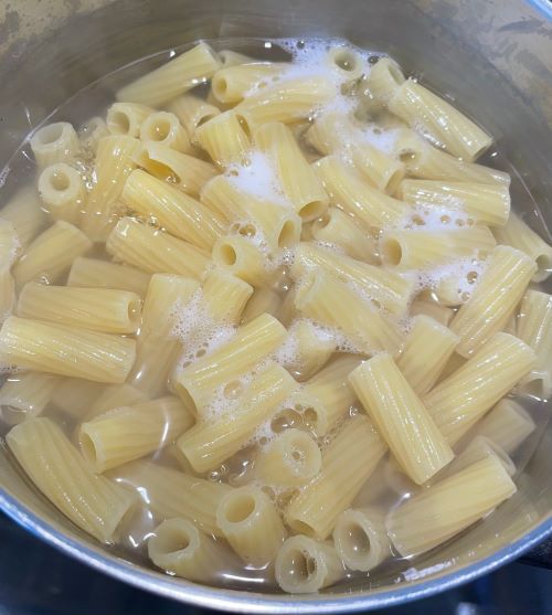 Cook 8 oz of dried pasta in 4 cups of water boiling with 1/2 tsp salt. Once the pasta is cooked, drain reserving 2 cups of pasta water in a separate bowl for use later.