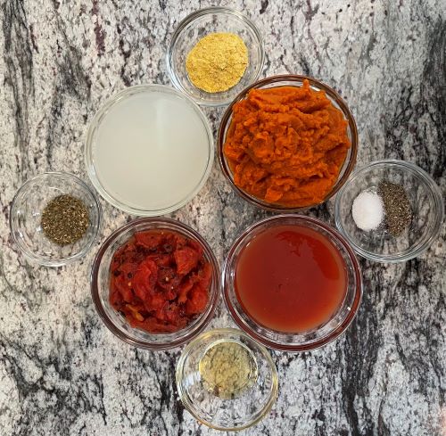 In a second sauce pot, combine the pumpkin, agave, nutritional yeast, fire-roasted tomato juice reserved, salt, pepper, fire-roasted tomatoes, dried herbs, and nutritional yeast.