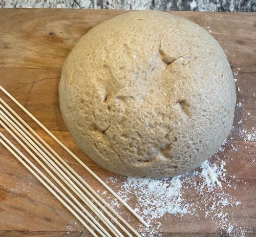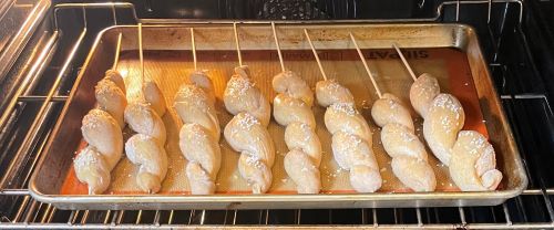 Take the log of dough that has been resting the longest and roll it into a 10-12 inch long rope of dough. Twist the dough around one of the skewers, moving the dough all the way up the skewer. Pinch the ends and place the twisty breadstick on the baking sheet. Repeat with the other pieces of dough until you have 12 breadsticks on your baking sheet.