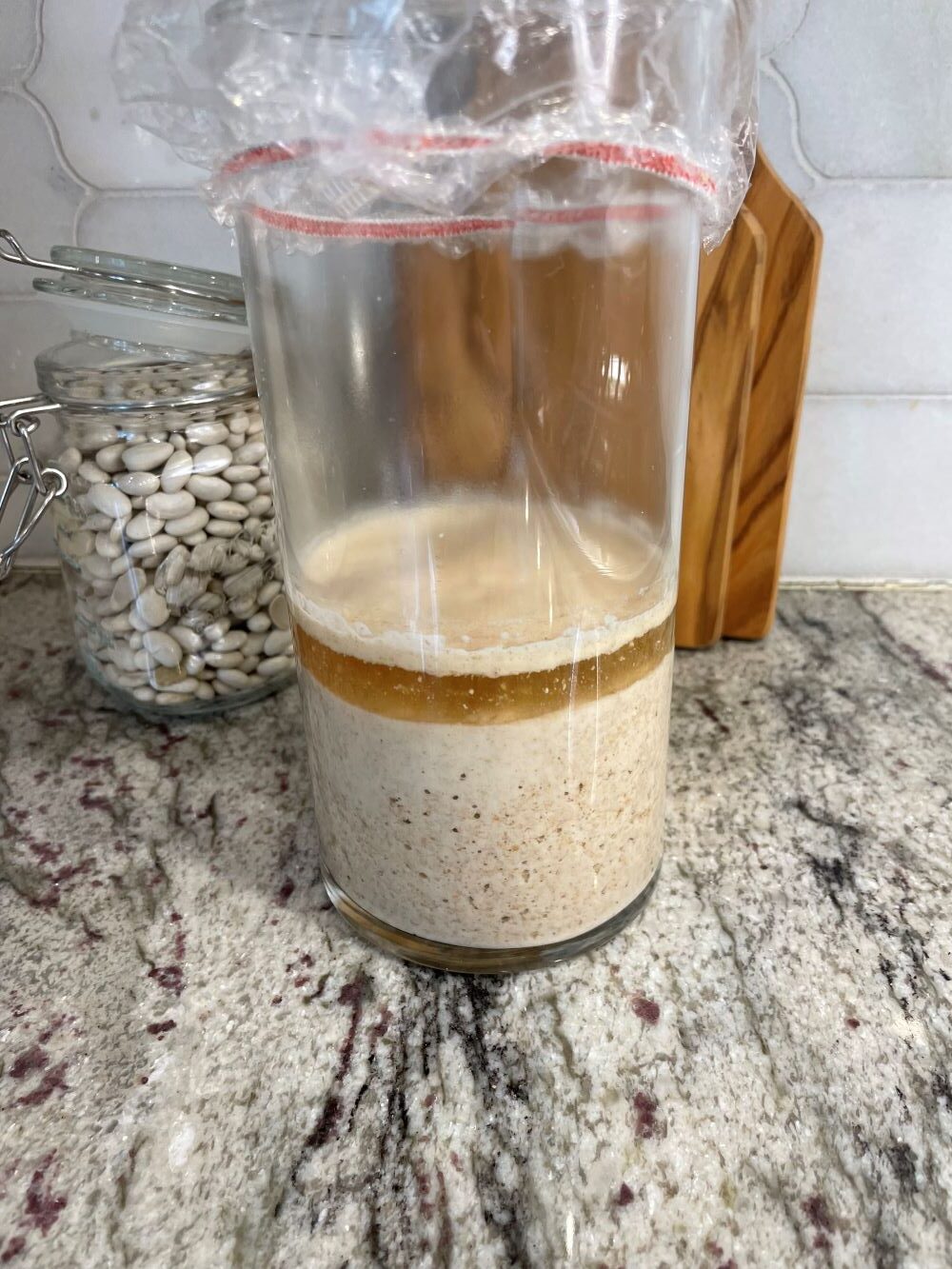 TIP: During this process, and even after your starter has been growing for a bit, a dark liquid might appear on the surface. It might have a very stinky smell. This liquid is called “hooch” and is an indication that your starter needs to be fed. It’s normal. Any time you see this liquid, it’s best to remove it along with any discolored starter present. However, on Day 2 just leave the hooch alone. You can remove it tomorrow when you start the feedings.