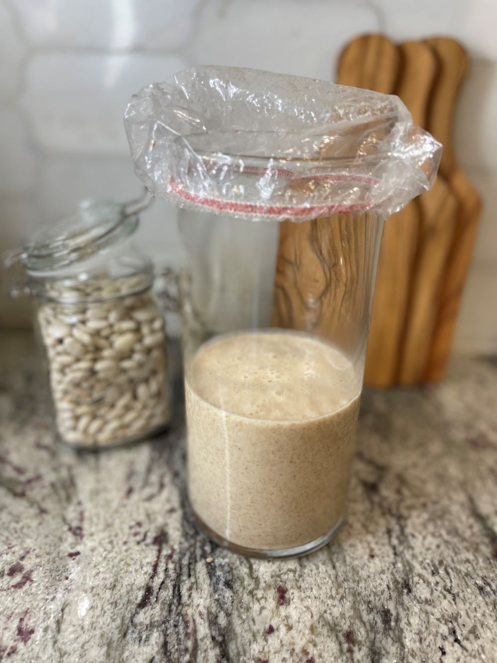 Day 1: Combine 60 g (1⁄2 cup) of whole wheat flour and 60 g (1⁄4 cup) of warm water in a large jar. Mix with a fork until smooth; the consistency will be thick and pasty. If measuring by volume, add more water to slightly thin out the texture if necessary. Cover with plastic wrap or a lid and let it rest in a warm spot, about 75-80 F, for 24 hours. Temperature is important.