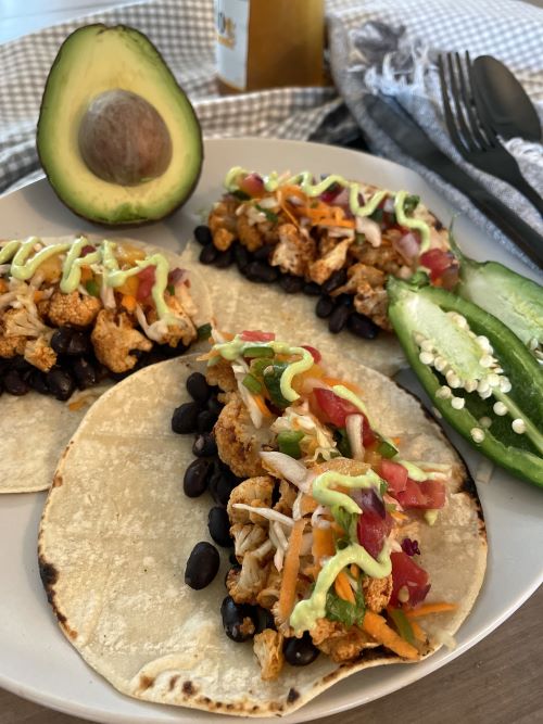 Indulge in the bold flavors of Spicy Roasted Cauliflower and Black Bean Tacos, where tender cauliflower florets are tossed in smoky spices and roasted to perfection. Nestled in warm tortillas, they're paired with hearty black beans, fresh cilantro, and a zesty lime avocado crema for a vibrant and satisfying taco experience that's both wholesome and full of zest. Perfect for a meatless meal bursting with Tex-Mex flair!
