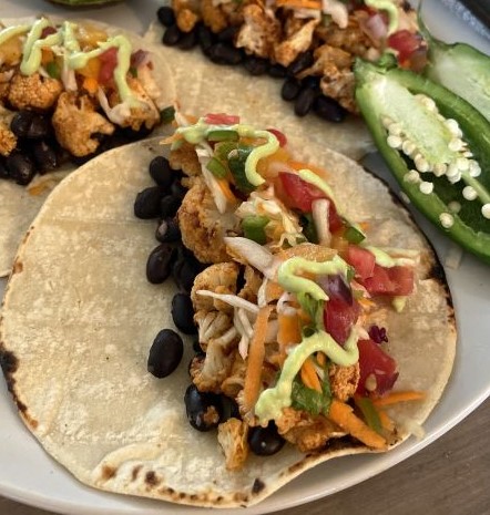 For each tortilla, add 2 tablespoons of black beans. Next layer with 2 tablespoons (8-5-8 pieces) of roasted cauliflower, then add 1 tablespoon salsa, top with 2 tablespoons of creamy slaw and garnish with fresh or pickled onions and or jalapenos.