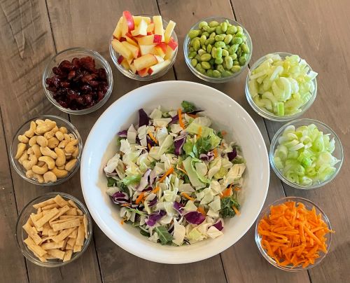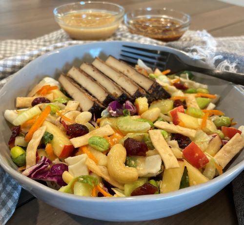 In a large mixing bowl add coleslaw or Asian chopped salad mix, shredded carrots, sliced celery, green onions, apples, dried cranberries, edamame, nuts, tofu and any other items of your choice.