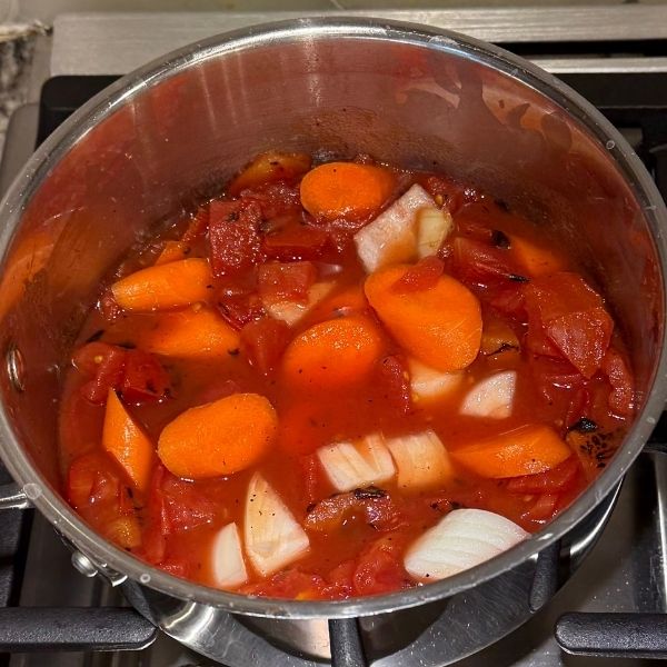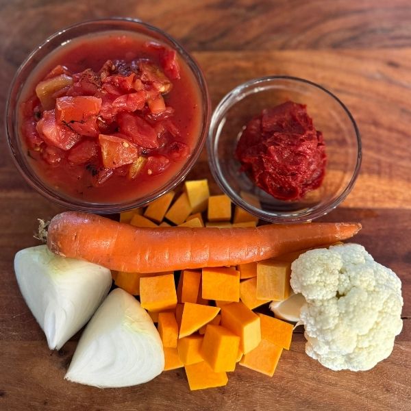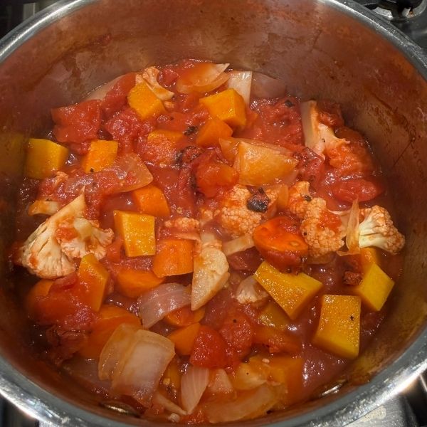 Cook the vegetables by placing the fire-roasted tomatoes with juices, onion, carrot, cauliflower, butternut squash, and water in a medium saucepan.