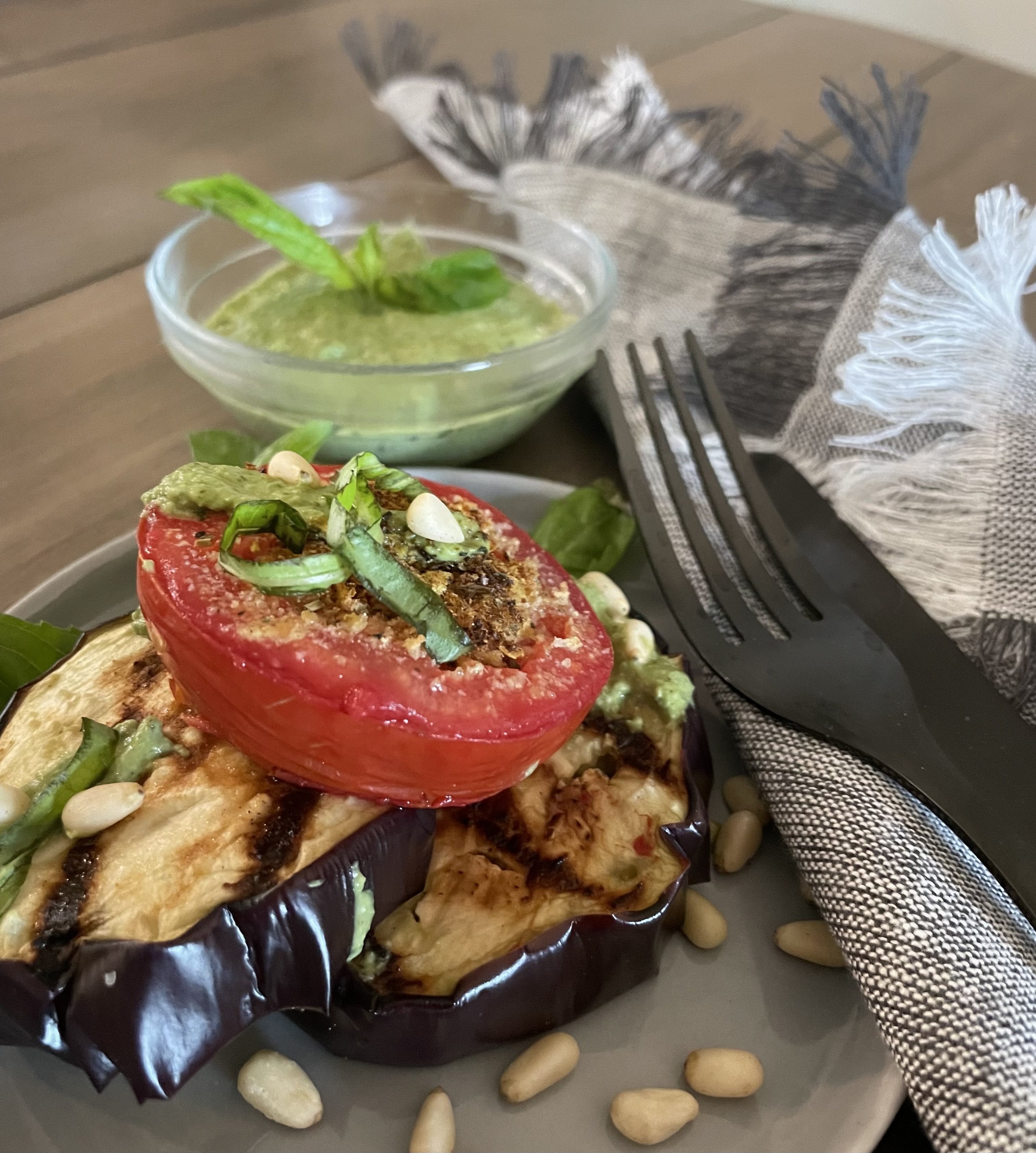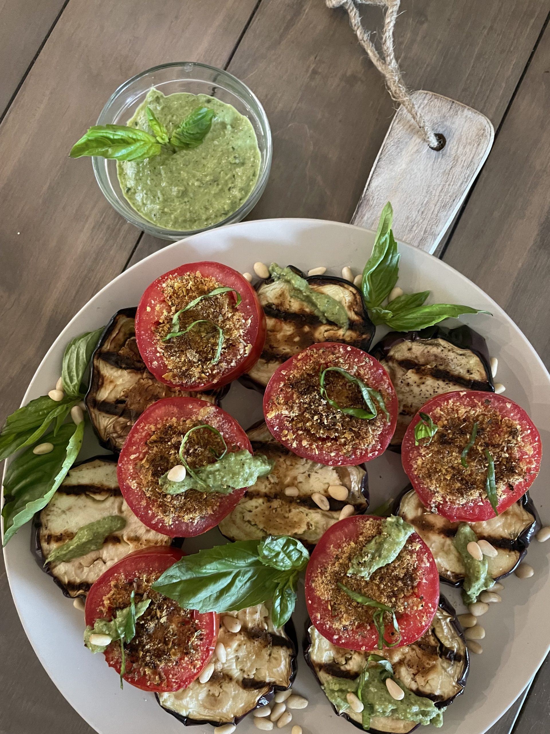 This WFPB grilled eggplant tomato basil pesto salad is best served slightly warm or room temperature. The oilless basil lemon pesto recipe uses my new obsession, preserved lemons.