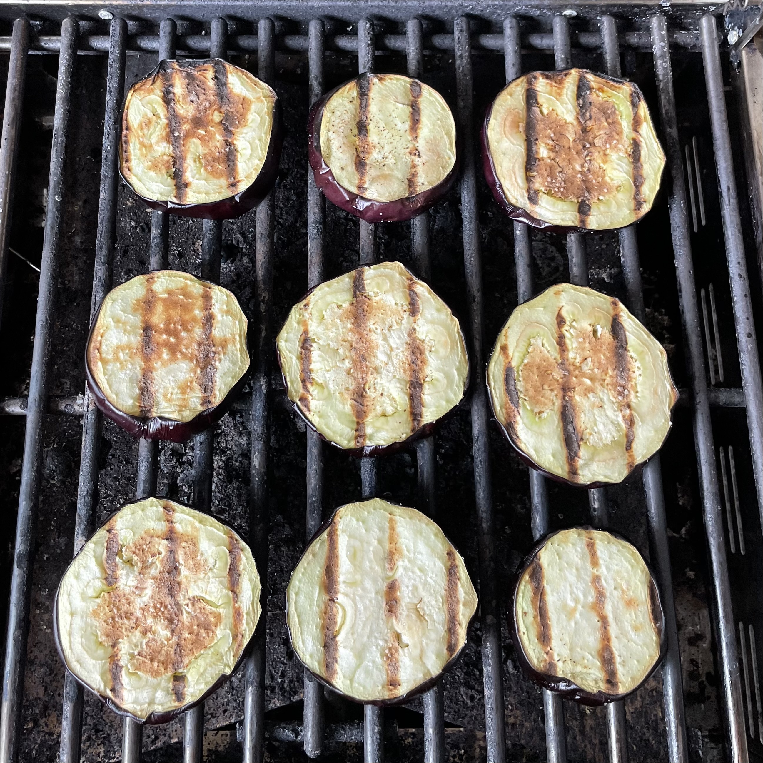 Heat grill to 450℉. Grill the eggplant for 3 minutes on one side to get those great grill marks. Flip and grill for 2 more minutes. Watch to not overcook them as you want them slightly firm. We want to be able to be cut with a knife and have it hold its shape.