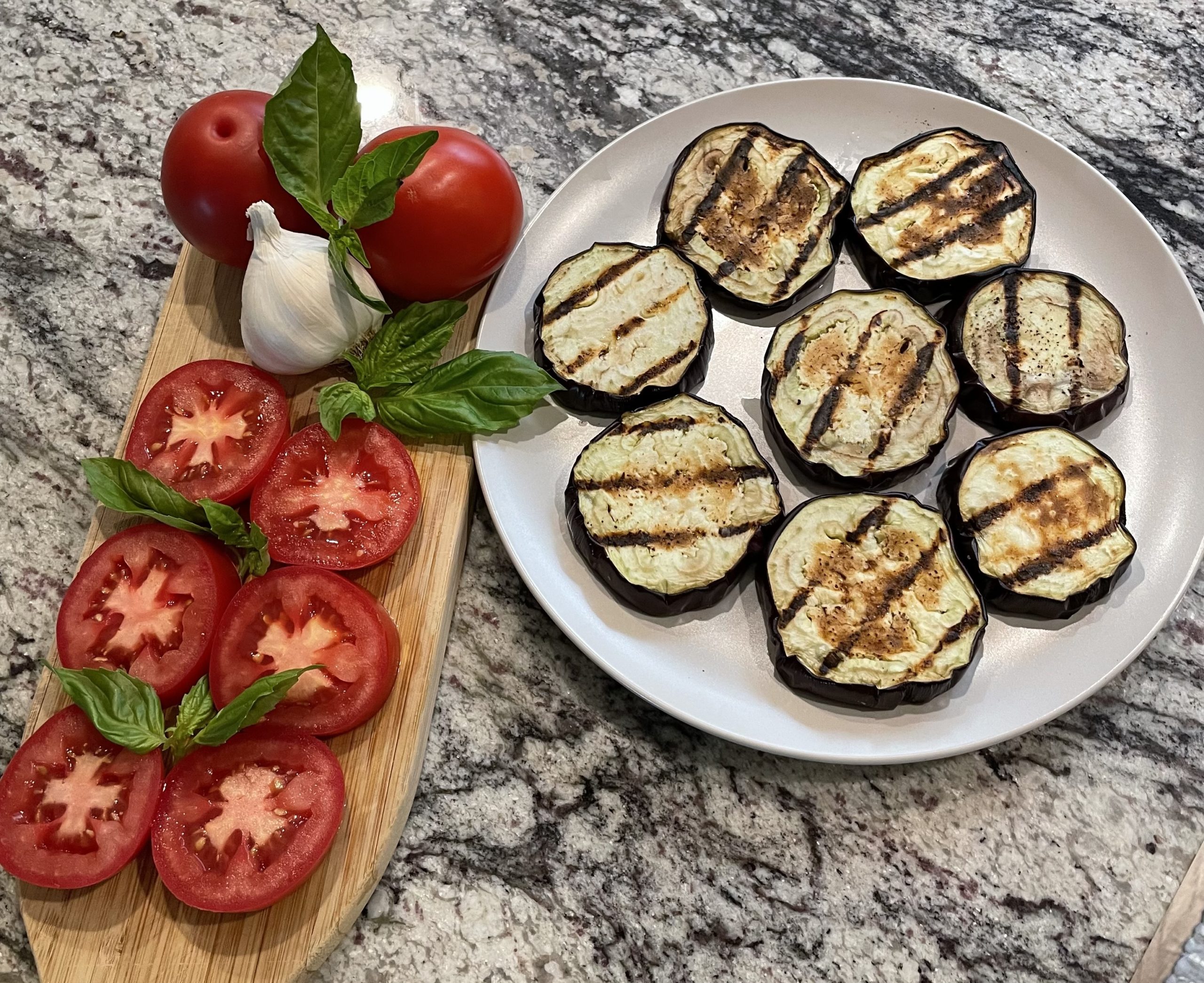 Lay the grilled eggplant on a plate. Arrange the broiled tomatoes on top of the eggplant.