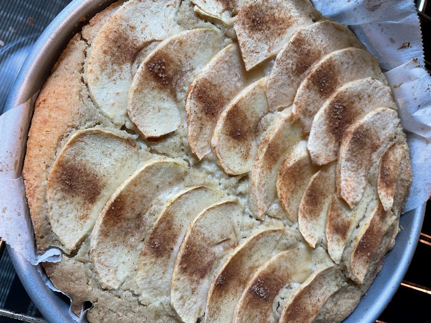 Pour the batter into your parchment paper lined cake pan. Lay the thin apple slices on the top in a pattern that suits you. Bake for 40-50 minutes, or until the top is golden and a toothpick inserted into the cake emerges clean. Allow the cake to cool before cutting into slices and serving. If you like, you can dust the top with confectioners sugar.